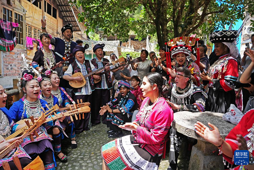 4月19日,在廣西桂林市龍勝各族自治縣龍脊鎮(zhèn)金江村黃洛瑤寨,當(dāng)?shù)厝罕姾屯鈬?guó)友人對(duì)山歌。(新華社發(fā) 韋吉陽(yáng) 攝)