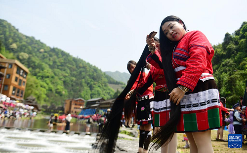 4月19日,在廣西桂林市龍勝各族自治縣龍脊鎮(zhèn)金江村黃洛瑤寨,瑤族婦女在河邊展示長(zhǎng)發(fā)梳妝。(新華社發(fā) 韋吉陽(yáng) 攝)