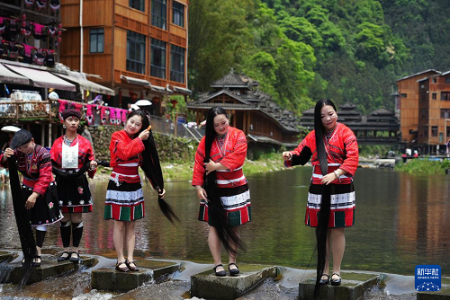 4月19日,在廣西桂林市龍勝各族自治縣龍脊鎮(zhèn)金江村黃洛瑤寨,瑤族婦女在河邊展示長(zhǎng)發(fā)梳妝。(新華社發(fā) 潘志祥 攝)
