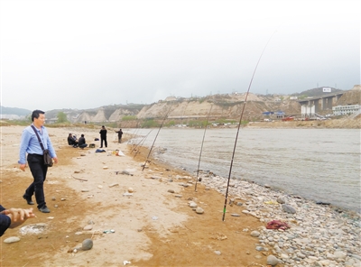 當(dāng)日下午3時許,蘭州晨報記者在雁白大橋西側(cè)的黃河岸邊看到12把魚竿一字排開,3名釣魚者坐在旁邊沙灘上正在等待魚兒上鉤,還有兩名中年男子正在周圍撒網(wǎng)。在相隔十多米處,記者發(fā)現(xiàn)還有兩名男子分別撐著魚竿釣魚,有一名捕魚者在撒網(wǎng)?!斑@是雙面粘漁網(wǎng),河內(nèi)稍大一些的魚兒只要撞進(jìn)網(wǎng)里就擺脫不了。”一名捕魚男子得意地說。
