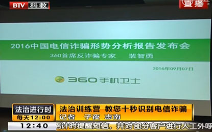 中國經(jīng)濟(jì)網(wǎng)北京9月12訊 生活中,當(dāng)你接到詐騙電話的時(shí)候,你要多久能發(fā)現(xiàn)這個(gè)騙局呢,10秒?20秒?還是根本識(shí)別不出來?9月10日,北京衛(wèi)視《法治進(jìn)行時(shí)》欄目在節(jié)目一開始便拋出了這樣一個(gè)問題。面對(duì)電信詐騙分子日益多變的手法,如何頭腦清晰地最快識(shí)別出騙局?這一期的《法治進(jìn)行時(shí)》和360手機(jī)衛(wèi)士專家一起給大家提供了很多實(shí)用的建議。