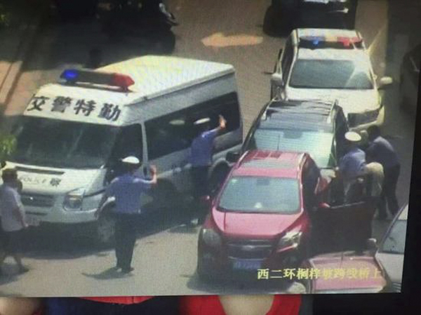 澎湃新聞從長沙市公安局交警部門了解到,事發(fā)12日下午1時許,當(dāng)民警對一臺由南往北行駛湘A27K07的黑色尼桑小型越野車進行檢查時,該駕駛?cè)司懿幌ɑ?,并緊閉車門、車窗,拒絕出示相關(guān)證件和下車配合接受酒精測試。約20分鐘后,駕駛?cè)送蝗粏榆囕v強行沖關(guān),撞開民警、警車和周邊車輛后逃逸,造成1名民警(韌帶挫傷)、2名群眾受傷(皮外傷),1輛警車(刮擦)、9輛群眾車輛受損。
