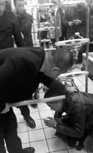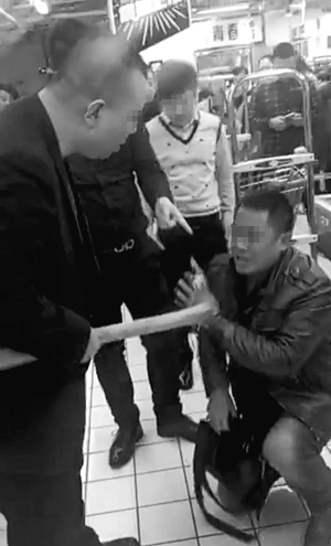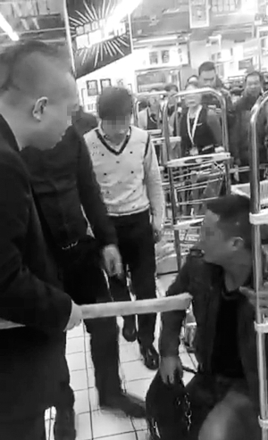 昨天,一段視頻在網(wǎng)上被熱議?!霸俨凰砷_把你腿削折了”,一棕色外套男子被逼跪在地上,抱著收銀臺附近的欄桿連連承諾“再不來了”。另外兩個大漢在旁拖拽他,其中一人用木棒打向男子,另一人在旁邊踢了該男子一腳,并威脅道:“再來讓你沒命”(如圖)。