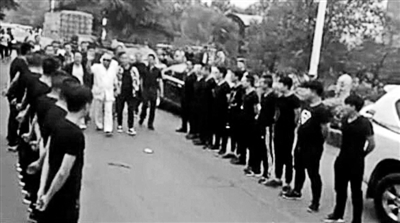 在監(jiān)獄管教樓前,蒙某錄等人指揮20余名黑衣人,在道路列隊彩排,并將14盤1萬響鞭炮及8個100響禮花炮擺放在監(jiān)獄門口附近及沿途道路上。上午10點,蒙某錄、程某林各持一束鮮花,帶領20余名黑衣人進入晉城監(jiān)獄管教大樓內,列隊迎接程幼澤出獄。