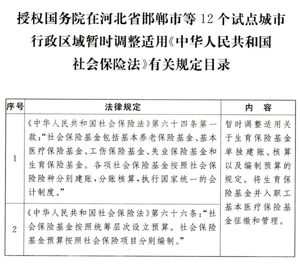 為進(jìn)一步增強(qiáng)生育保險(xiǎn)保障功能,提高社會(huì)保險(xiǎn)基金共濟(jì)能力,推進(jìn)生育保險(xiǎn)和基本醫(yī)療保險(xiǎn)合并實(shí)施改革,第十二屆全國人民代表大會(huì)常務(wù)委員會(huì)第二十五次會(huì)議決定:授權(quán)國務(wù)院在河北省邯鄲市、山西省晉中市、遼寧省沈陽市、江蘇省泰州市、安徽省合肥市、山東省威海市、河南省鄭州市、湖南省岳陽市、廣東省珠海市、重慶市、四川省內(nèi)江市、云南省昆明市行政區(qū)域暫時(shí)調(diào)整適用《中華人民共和國社會(huì)保險(xiǎn)法》第六十四條、第六十六條關(guān)于生育保險(xiǎn)基金單獨(dú)建賬、核算以及編制預(yù)算的規(guī)定(目錄附后),將生育保險(xiǎn)基金并入職工基本醫(yī)療保險(xiǎn)基金征繳和管理。試點(diǎn)方案由國務(wù)院作出安排,并報(bào)全國人民代表大會(huì)常務(wù)委員會(huì)備案。本決定實(shí)施期限為二年。