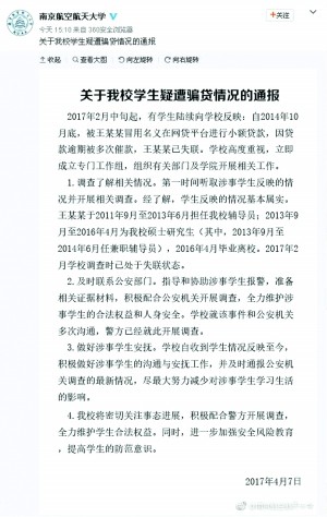 在4月7日下午,“@南京航空航天大學(xué)”官微發(fā)布了“關(guān)于我校學(xué)生疑遭騙貸情況的通報(bào)”,通報(bào)稱(chēng),從2017年2月中旬起,有學(xué)生陸續(xù)向?qū)W校反映,自2014年10月底,被王某冒用名義在網(wǎng)貸平臺(tái)進(jìn)行小額貸款,因貸款逾期被多次催款,王某已失聯(lián)。學(xué)校高度重視,立即成立專(zhuān)門(mén)工作組,組織有關(guān)部門(mén)及學(xué)院開(kāi)展相關(guān)工作。經(jīng)調(diào)查了解,學(xué)生反映的情況基本屬實(shí)。