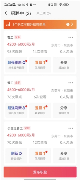 吳林提到,他們購買企業(yè)招聘賬戶后,還要花錢請人在招聘平臺上代發(fā)招聘帖,“發(fā)招聘帖特別嚴格,發(fā)不好就封賬號,發(fā)帖后,怎么能在平臺上排到最前面,也是需要重點考慮的。”