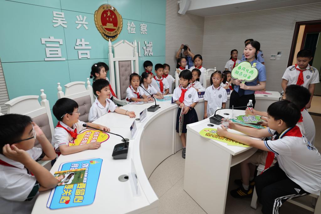 2024年7月3日,湖州市吳興區(qū)人民檢察院檢察官帶領(lǐng)小學(xué)生參觀(guān)未成年人檢察辦案區(qū)。新華社記者 黃宗治 攝