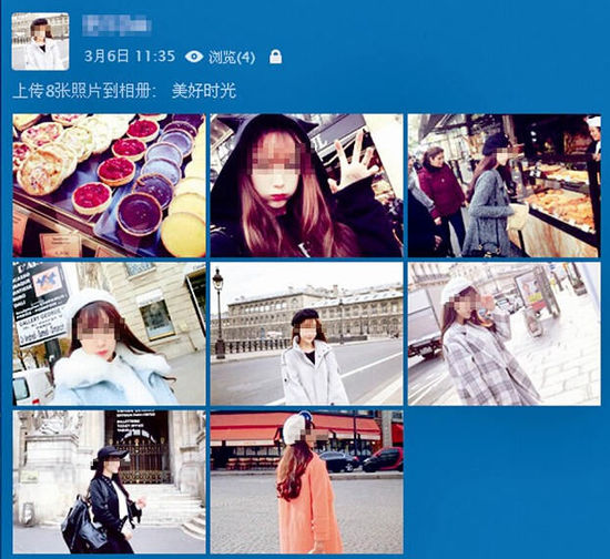 “最好找粉絲在10萬以下的網(wǎng)紅?!痹谖⒉┥?,魏強(qiáng)嫻熟地搜到一個名為“Panny”的模特,點(diǎn)擊其關(guān)注的好友,找到類似幾名網(wǎng)紅,讓記者下載她們的照片,用修圖軟件清除圖片上的水印,再上傳到QQ空間。魏強(qiáng)在QQ上假扮的“白富美”網(wǎng)名叫“Eiffel”,他還煞費(fèi)苦心地更新“Eiffel”的QQ空間。