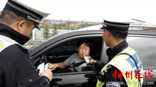 九大隊民警正在對過往司機(jī)進(jìn)行酒精測試