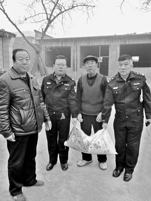 近年來,大隊把扶貧工作當作一項政治任務抓在手上,為了更好地精準扶貧,按計劃力爭提前完成扶貧攻堅任務。2015年,李晉生擔任了原平市南白鄉(xiāng)尚義村的第一書記,負責該村的幫扶工作。南白鄉(xiāng)尚義村是原平市的重點貧困村,也是交警大隊幫扶村,全村204人,貧困人口占80%。當年12月17日,他自籌2000多元,購買了米、面、糧、油,與大隊的4位民警來到了南白鄉(xiāng)尚義村走訪慰問特困家庭。在全市開展精準扶貧的攻堅階段,為了讓特困家庭度過溫暖的冬季,交警大隊民警進村入戶共慰問五保戶、特困戶8戶,為他們送去了面粉、大米和食用油。同時,大隊長還看望了90歲高齡的抗戰(zhàn)老兵趙書良,1925年出生的趙書良老人,17歲時就參軍,在抗日戰(zhàn)爭中多次立功授獎。當老人雙手接過慰問金后,激動地說:“還是共產(chǎn)黨好,人民警察和人民真是心連心?。 ?