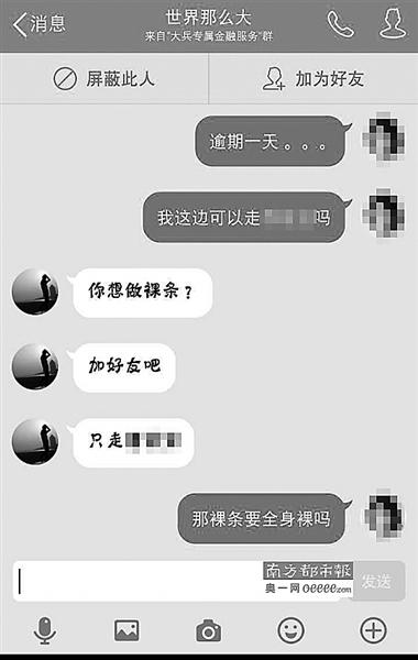 13日,記者調(diào)查發(fā)現(xiàn),在一些借款群中,女大學生“裸持”借款已經(jīng)成為公開的秘密,通過“裸持”可以借款的金額是普通借款額度的2至5倍,但逾期未還將面臨裸照被公布的威脅,甚至有借款人威脅“裸持”借款的女生提供性服務(wù)。