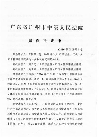 7年前,因在廣州市越秀區(qū)一德路賣20支仿真槍,河北人王國(guó)其被控非法買賣、運(yùn)輸槍支罪,并坐了4年牢。今年2月底,他在獲得了越秀區(qū)檢察院的無罪認(rèn)定后,申請(qǐng)了國(guó)家賠償。近日,廣州市中級(jí)人民法院作出決定,賠償王國(guó)其人身自由損害賠償金共計(jì)35 .4萬(wàn)元,精神損害撫慰金8萬(wàn)元,并在侵權(quán)行為影響范圍內(nèi)為其消除影響、恢復(fù)名譽(yù)、賠禮道歉。對(duì)于這個(gè)結(jié)果,王國(guó)其說,不想再折騰了,希望能盡快回歸正常生活。 賣“仿真槍”一審曾被判10年 2009年10月19日,在廣州一德路玩具市場(chǎng)賣仿真槍的王國(guó)其被警方帶走。此時(shí)距離他到廣州也就半年多時(shí)間,之前他在河北邯鄲的建筑工地當(dāng)工人,為了謀生,他賣掉了家里的糧食和豬到廣州投奔親戚。 王國(guó)其告訴北京青年報(bào)記者,他剛到廣州那會(huì)兒先是做婚慶生意,賣些氣球、玩具用品,但是因?yàn)樽鲞@行的人多,生意不好干,掙不到多少錢。后來他發(fā)現(xiàn)買仿真槍玩的人非常多,大人小孩都有,“看到那些賣的人生意都挺好的,我于是也開始賣,貴的兩三百,便宜的30多塊。顧客里很多是玩野戰(zhàn)游戲的白領(lǐng),還有家長(zhǎng)給孩子買?!?br /> 王國(guó)其并沒有想到禍?zhǔn)聲?huì)由此開始。7年之后,當(dāng)他再次回憶起當(dāng)時(shí)的時(shí)光,他仍然有些心有余悸,“從此不會(huì)再碰這個(gè)東西了,現(xiàn)在做什么都很小心,沒有什么明確的規(guī)定我絕對(duì)不干?!?/p> 2009年10月19日王國(guó)其像往常一樣,跑到貨運(yùn)站去給客戶發(fā)貨,但沒想到,這一次卻出了大問題。等他從貨運(yùn)站回到家,就接到了貨運(yùn)站的電話,對(duì)方說他的貨單有問題,讓他去看一看貨單怎么回事,然后他就被等在那里的警察抓獲。 2010年5月,廣州市越秀區(qū)法院作出一審判決,以王國(guó)其犯非法買賣、運(yùn)輸槍支罪,判處有期徒刑10年?!澳切屛以囘^啊,都是塑料的,就是玩具,從來沒想過會(huì)因?yàn)橘u那個(gè)被判刑,當(dāng)時(shí)聽到自己判10年直接號(hào)啕大哭。” 王國(guó)其不服,提出上訴,但廣州中院于2010年12月20日作出終審裁定:駁回上訴,維持原判。案件由此生效,王國(guó)其開始了自己的牢獄生涯。對(duì)于自己在監(jiān)獄里的生活,王國(guó)其并不愿意回憶太多。 案件6年7審終獲“無罪”認(rèn)定 在監(jiān)獄服刑的王國(guó)其向廣州中院提出了申訴,此后的6年里,王國(guó)其販賣仿真槍案經(jīng)歷一審、二審、再審、復(fù)核、重審一審、準(zhǔn)予撤訴、發(fā)回重審,檢察院最終作出了不起訴決定。 2013年,廣州中院?jiǎn)?dòng)再審程序并作出判決,撤銷前面的終審裁定和越秀區(qū)法院一審判決中的量刑部分,但維持了一審法院定罪部分,以非法買賣、運(yùn)輸槍支罪,改判王國(guó)其有期徒刑4年。由于低于法定刑期,判決需報(bào)請(qǐng)廣東高院與最高法核準(zhǔn)后生效。