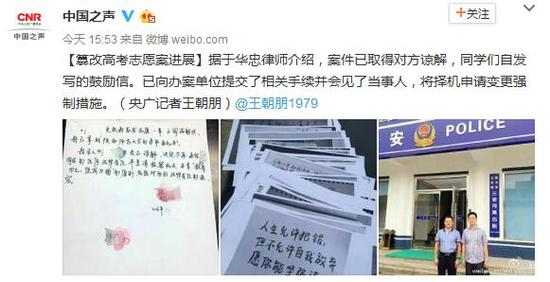 備受關(guān)注的山東青島膠州高三畢業(yè)生常升高考志愿被 同學(xué)郭某某篡改一事有最新進(jìn)展。案件已取得對(duì)方諒解,同學(xué)們自發(fā)寫鼓勵(lì)信。已向辦案單位提交了相關(guān)手續(xù)并會(huì)見了當(dāng)事人,將擇機(jī)申請(qǐng)變更強(qiáng)制措施。(來源:中國之聲)