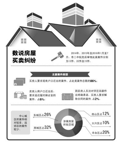 雖然房子賣了,但是賣家卻遲遲不遷走戶口;買了學(xué)區(qū)房因無法落戶導(dǎo)致孩子上學(xué)成了泡影……昨天,市二中院召開房屋買賣合同糾紛案件發(fā)布會(huì),調(diào)研顯示,買房人要求現(xiàn)有戶口遷出案件占房屋買賣合同糾紛總數(shù)的86%,因戶口遷移引發(fā)的此類案件近年呈增長(zhǎng)趨勢(shì)。市二中院表示,根據(jù)現(xiàn)行法律和政策,警方和法院都無法強(qiáng)迫原房主遷移戶口。