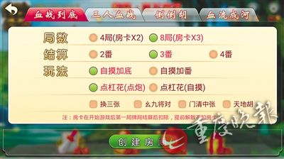 進(jìn)入游戲后,界面顯示“創(chuàng)建房間”和“加入房間”兩項(xiàng)。玩家創(chuàng)建房間時(shí),可選擇局?jǐn)?shù)、玩法等具體設(shè)置,還能選“自摸加底”“自摸加番”“點(diǎn)杠花(點(diǎn)炮)”“點(diǎn)杠花(自摸)”“換三張”等,然后通過微信邀請(qǐng)好友加入牌局。接到邀請(qǐng)的玩家,輸入房間號(hào)后就能進(jìn)入牌局,通過手機(jī)聯(lián)網(wǎng)打麻將。