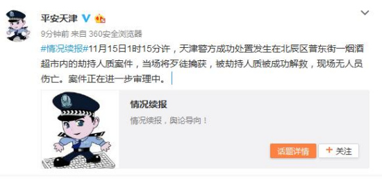 中新網11月15日電 據天津市公安局官方微博通報,11月15日1時15分許,天津警方成功處置發(fā)生在北辰區(qū)普東街一煙酒超市內的劫持人質案件,當場將歹徒擒獲,被劫持人質被成功解救,現(xiàn)場無人員傷亡。