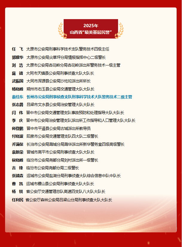 任飛、郭耀華、劉浩、龐靖、武振國、楊曉峰、秦佳東、張志勇、閆偉、李慶、師登鵬、付曉波、喬滿保、袁新榮、侯曉峰、吉鋒、張靖森、曹凱、楊銳、任利民20名同志光榮入選,其中,太原市公安局刑事科學技術支隊民警任飛還入選2025全國“最美基層民警”。