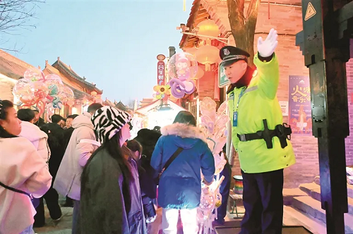與熱鬧喜慶人群相伴而行的是執(zhí)勤民警貼心服務(wù)的身影。