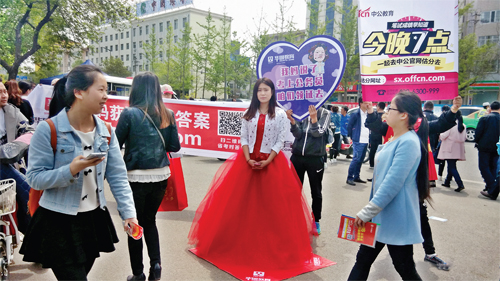 4月23日11點(diǎn)左右,記者在我市城區(qū)忻州一中校門口看到,一名身穿紅色婚紗裙的女生舉著牌子——“我媽說了,考上公務(wù)員,咱們領(lǐng)證去”。當(dāng)天是2016年山西省公務(wù)員考試筆試的日子,這是一家公考培訓(xùn)機(jī)構(gòu)在考點(diǎn)附近進(jìn)行宣傳活動(dòng),宣傳者靚麗的外表、婚紗裙的著裝和新奇的廣告語吸引了很多考生的目光,甚至一些路人也駐足觀看。不過,這種夸張的廣告詞,所謂的“考上公務(wù)員去領(lǐng)證”的想法是否正確,也應(yīng)該引起大家的反思。(許凈 攝)