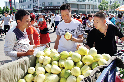 5 月29 日,原平市王家莊鄉(xiāng)弓家莊村的農(nóng)民正在農(nóng)貿(mào)市場銷售大棚香瓜、蔬菜。近年來,該市加大財政扶持力度,加快產(chǎn)業(yè)結(jié)構(gòu)調(diào)整,大力發(fā)展蔬菜大棚。目前,該村戶均1座大棚,人均產(chǎn)值1.5 萬元。(褚震 攝)