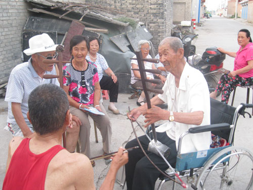 7月31日,河曲縣北元村一處街頭巷口傳出陣陣音樂和“山曲兒”聲。愛好文藝的氣象局退休人員段王鎖和村民經(jīng)常相聚街頭巷口,吹的吹,拉的拉,唱的唱,每每吸引鄉(xiāng)親們前來共享“農家樂”。既起到了陶情怡性的作用,也給鄉(xiāng)親們帶來具有鄉(xiāng)土風味的精神食糧。(賈金理 攝)