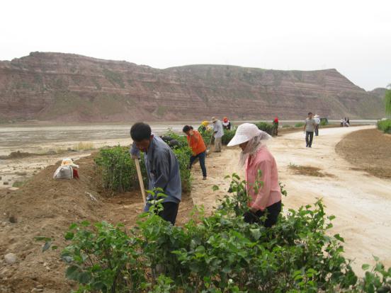 9月4日,河曲縣黃河岸邊20多名工人正在栽植丁香綠化帶。入秋以來,該縣對(duì)初具規(guī)模的濱河濕地公園優(yōu)化提質(zhì)和適當(dāng)擴(kuò)展,一方面增修了公園曲徑、小亭,一方面對(duì)公園邊緣進(jìn)行補(bǔ)綠,在護(hù)河堤栽植爬地柏、三七景天,空擋地帶栽植丁香,進(jìn)一步增加綠化面積,提升公園檔次和品位。據(jù)悉,該公園面積達(dá)450畝。(賈金理 攝)