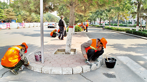 9月15日,正值中秋佳節(jié),市政工程公司員工放棄休息,在長(zhǎng)征街修補(bǔ)路牙石,為我市城區(qū)創(chuàng)建國(guó)家衛(wèi)生城市盡自己的職責(zé)。(郭健 攝)