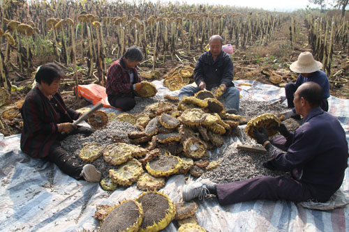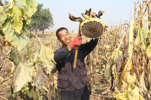 10月13日,原平市解村鄉(xiāng)圪坨村林同種植專業(yè)合作社正在收獲向日葵,該社引進三瑞公司種植1000余畝SH363向日葵喜獲豐收。近年來,該市積極引導農(nóng)民調(diào)整農(nóng)業(yè)產(chǎn)業(yè)結構,采取“合作社+農(nóng)戶”的模式,向日葵比玉米收入高四倍,銷售價每斤4塊左右,合作社為農(nóng)戶提供種子、種植技術等服務,帶動當?shù)厝罕娫鍪罩赂弧?span style="font-family: 楷體,楷體_gb2312, simkai">圖為解村鄉(xiāng)村民趁著秋高氣爽的晴好天氣,在田間地頭葵花籽的情景。(褚震 攝)