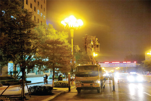 路燈檢修工人穿好工作服,戴上安全帽,登上搶修車的工作臺,對路燈、接線箱、燈桿等照明設施進行了全面細致的檢查、維護、更換。10月26日9時許,記者在我市城區(qū)長征路上看到,市政公司組織工人冒著凜冽的寒風,正在對道路兩旁損壞的路燈進行更換,確保夜幕下城區(qū)的每一盞路燈都能夠正常照明。圖為工人師傅正在長征路上對損壞的路燈進行更換。(張志遠 王菲 攝)