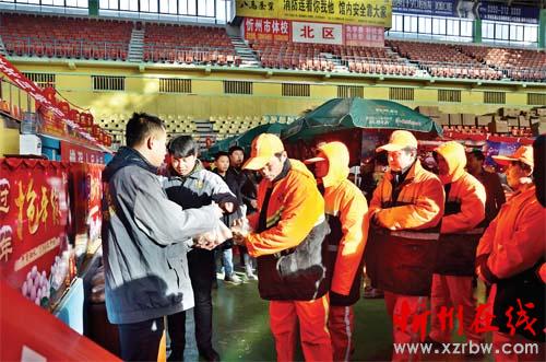 1月19日上午,山西熊奪寶網(wǎng)絡(luò)科技有限公司面向忻州市環(huán)衛(wèi)系統(tǒng)開展“獻(xiàn)愛心迎佳節(jié)”活動(dòng),來自忻州市市容環(huán)境衛(wèi)生管理處的50名環(huán)衛(wèi)工人代表,每人領(lǐng)到了一份新鮮雞蛋?,F(xiàn)場(chǎng)的一位工作人員告訴記者:“環(huán)衛(wèi)工人們?yōu)榱顺鞘械母蓛粽麧嵏冻隽诵燎诘暮顾?,希望這些雞蛋能為他們補(bǔ)補(bǔ)身體。除現(xiàn)場(chǎng)領(lǐng)取雞蛋的50名環(huán)衛(wèi)工人之外,我市另外的1000多名環(huán)衛(wèi)工人也將陸續(xù)領(lǐng)到愛心雞蛋。”領(lǐng)到雞蛋的環(huán)衛(wèi)工李大姐高興地說:“今年過年雞蛋也不用買了,實(shí)在是太好了!”(王菲 郭劍鳴 攝)