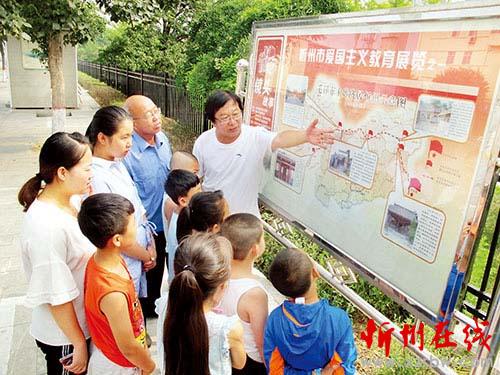 檔案人董建平(中)向青少年義務(wù)宣講愛國主義教育展覽。