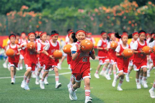 學(xué)生在運動會上展示集體籃球操