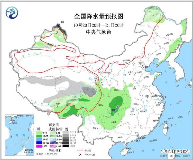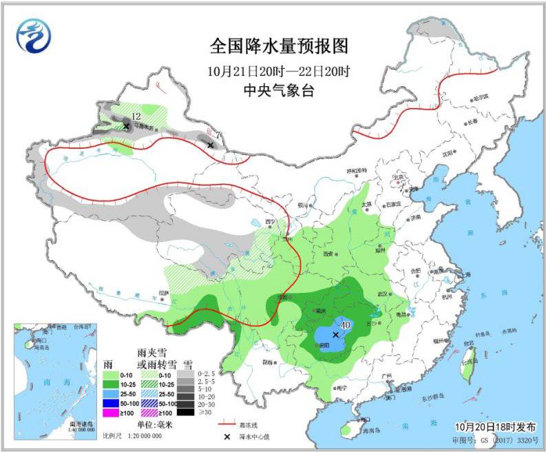 10月20日20時(shí)至21日20時(shí),新疆北疆北部和西部、青海南部、西藏北部、內(nèi)蒙古東北部、黑龍江西北部等地的部分地區(qū)有小到中雪或雨夾雪,其中,北疆北部山區(qū)有大到暴雪(10~18毫米)。西藏東南部、陜西南部、四川盆地東部、重慶大部、貴州北部等地的部分地區(qū)有中到大雨(10~40毫米)。內(nèi)蒙古東部、東北地區(qū)北部、新疆北部、西藏北部等地的部分地區(qū)有4~6級(jí)風(fēng),新疆山口風(fēng)力可達(dá)10級(jí)左右(見(jiàn)圖1)。
