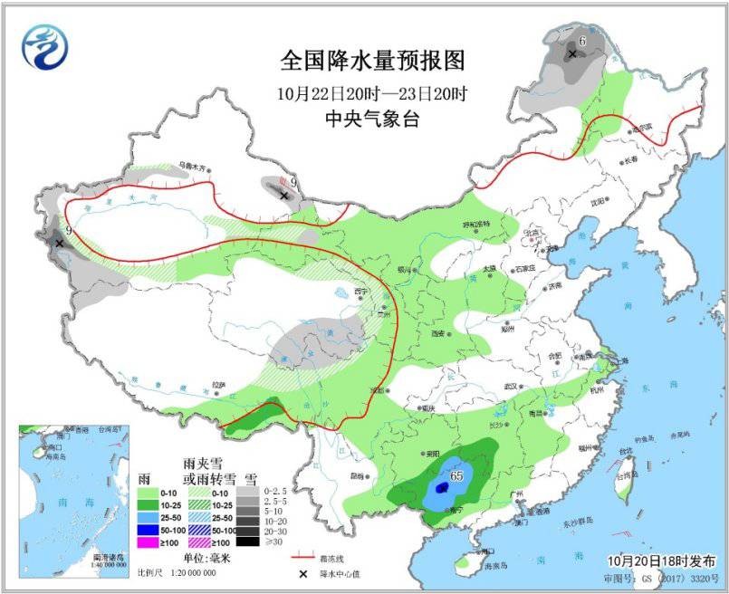 10月22日20時(shí)至23日20時(shí),新疆沿天山地區(qū)和南疆西部、青海東南部、西藏東北部及內(nèi)蒙古東北部、黑龍江西北部等地有小到中雪或雨夾雪,局地大雪(5~9毫米),西北地區(qū)東部、內(nèi)蒙古中西部、山西南部、西南地區(qū)東南部、江南中西部、華南大部等地有小雨,其中貴州東南部、廣西中北部等地有中到大雨,局地有暴雨(50~65毫米)。新疆東部部分地區(qū)有5~6級(jí)風(fēng)(見(jiàn)圖3)。