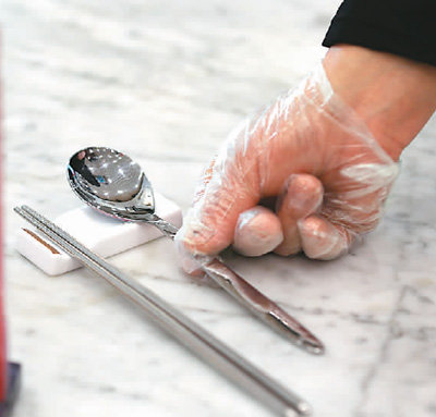 河北省武安市一家餐廳工作人員在擺放公筷公勺。新華社記者 王 曉攝