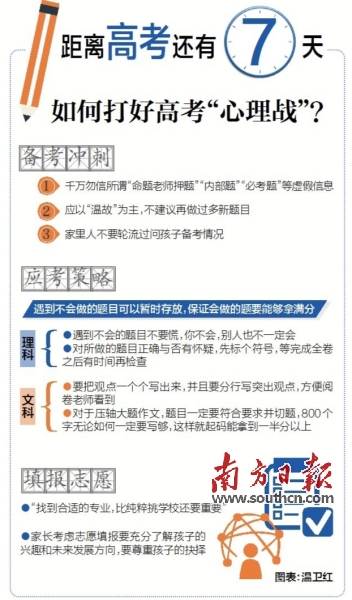 張敏強(qiáng)不忘囑咐家長,要創(chuàng)造寬松、良好的環(huán)境,讓考生輕松上陣?!耙欢ㄒ尯⒆有菹⒑茫a(bǔ)品不要吃太多,家里其他的人,不要每個(gè)人都過問?!彼€提醒,所有的高考用具,要備份一套。