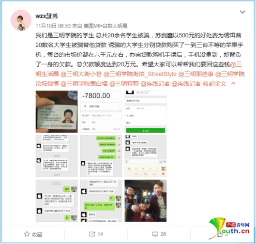 近日福建三明學(xué)院有學(xué)生發(fā)微博稱,自己與多名同學(xué)被誘騙貸款買(mǎi)手機(jī),辦完貸款購(gòu)機(jī)手續(xù)后,手機(jī)沒(méi)拿到卻背了一身債務(wù)。20名大學(xué)生總欠款額度達(dá)20多萬(wàn)。
