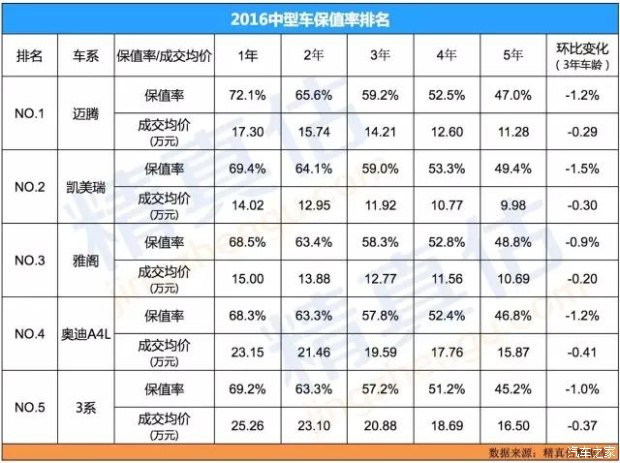緊湊車型保值率2016年整體壓力較大,主要是15-20萬元的B級(jí)別車型推出的中低端配置價(jià)格下探造成交叉競(jìng)爭(zhēng)態(tài)勢(shì)明顯,如帕薩特1.4T、邁騰1.4T、日產(chǎn)逍客低配版等。因此緊湊車型的較高保值率車型與新車交叉,市場(chǎng)存量本身減少,所以保值率下降趨勢(shì)仍將持續(xù)。 一汽-大眾高爾夫系列保值率集中在高爾夫6代,目前在售的7代高爾夫本身表現(xiàn)一般,預(yù)計(jì)后期的保值率將不如6代高爾夫堅(jiān)挺,相對(duì)6代高爾夫中1.6系列自動(dòng)擋表現(xiàn)相對(duì)穩(wěn)定,保值率最好,而1.4T的7速DSG變速箱廣受詬病,購買時(shí)候應(yīng)特別注意。 一汽-大眾寶來始終是穩(wěn)定表現(xiàn)車型,歷經(jīng)過此換代改款仍舊是這一價(jià)位三廂轎車的標(biāo)桿車型,尤其是二手車市場(chǎng)寶來的口碑和表現(xiàn)較好,主要是南北方認(rèn)知差異小,全國流通好,這也要得益于大眾的品牌網(wǎng)絡(luò)化建設(shè),不過近幾年的寶來保值率優(yōu)勢(shì)正在減少,日系競(jìng)爭(zhēng)對(duì)手較強(qiáng),如卡羅拉,新思域等。 一汽-大眾捷達(dá)是中國特色的“神車”,新捷達(dá)可以說與老款雖然產(chǎn)品特點(diǎn)有明顯差異,但是捷達(dá)的產(chǎn)品特點(diǎn)依舊沒有改變,就是三廂入門最便宜的大眾車,捷達(dá)售價(jià)和占有率以及早期口碑影響了保值率表現(xiàn),而實(shí)際新捷達(dá)的市場(chǎng)表現(xiàn)與競(jìng)爭(zhēng)對(duì)手相比并沒有更多的私家車因素,工具公務(wù)車典型,尤其是專車的市場(chǎng)托起了保值率表現(xiàn),但是未來也將受到很大的影響。 東風(fēng)日產(chǎn)騏達(dá)是緊湊型轎車中最受歡迎的家用車之一,日產(chǎn)這款車的設(shè)計(jì)和本田飛度的理念近似,就是內(nèi)部空間大,整體經(jīng)濟(jì)性好,省油省心,用料上雖然節(jié)省但是做工尚可,核心部件使用可靠性可以,所以二手車市場(chǎng)轉(zhuǎn)手率高,故障率低,供需穩(wěn)定保值率比較好。 豐田卡羅拉在推出雙擎系列后整體產(chǎn)品的零售端吸引力增強(qiáng),早期的花冠加后期的卡羅拉以及升級(jí)的雙擎產(chǎn)品實(shí)際是三線補(bǔ)充銷售,產(chǎn)品價(jià)格7-16萬元,覆蓋了很多二手車競(jìng)爭(zhēng)對(duì)手區(qū)域,豐田的口碑、質(zhì)量和服務(wù)網(wǎng)絡(luò)的確讓卡羅拉中后期保值率表現(xiàn)更好,屬于家用三廂車的推薦車型。 三、中型車保值率分析