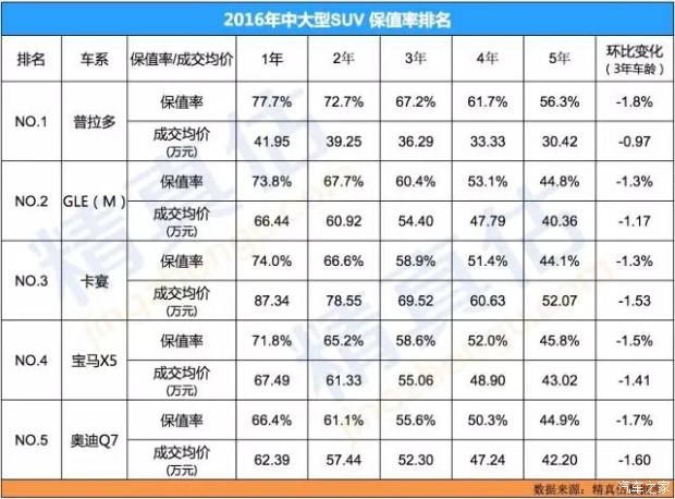 中大型SUV中,豐田普拉多和蘭德酷路澤系列以及雷克薩斯LX570基本優(yōu)勢(shì)明顯,余下也主要是德系為主,這一空間保值率表現(xiàn)穩(wěn)定車型幾乎看不到其他品牌。 豐田普拉多系列保值率高屬于“地球人都知道”的事實(shí),質(zhì)量可靠,技術(shù)穩(wěn)定,維修保養(yǎng)價(jià)格合理,相對(duì)油耗并不低,主要是越野愛好者和公務(wù)用車提高了這款車的保值率。 奔馳ML級(jí)別比較中,零配件價(jià)格的劣勢(shì)減少,因?yàn)橥?jí)別車型維修保養(yǎng)成本基本相當(dāng),新款GLE加價(jià)且供應(yīng)不足,二手車價(jià)格一路上漲,造成保值率提升,明年隨著新車價(jià)格下降到合理空間,預(yù)計(jì)整體保值率回歸理性。 保時(shí)捷卡宴系列保值率排名第三,保時(shí)捷品牌的優(yōu)勢(shì)有較大的影響力,此外SUV系列中保時(shí)捷品牌感覺略高于BBA,而同級(jí)別的瑪莎拉蒂、路虎價(jià)格略高,入門級(jí)別卡宴性價(jià)比較好,保值率高理所當(dāng)然。 寶馬X5系列市場(chǎng)存量和車型豐富占有一定的優(yōu)勢(shì),2002年的10萬元起步到X5M的兩百萬,可選擇空間大,全國通用性好,零配件和服務(wù)網(wǎng)絡(luò)相對(duì)理想,所以保值率也比較穩(wěn)定,新車價(jià)格并沒有大幅度調(diào)整。 奧迪Q7在2016年保值率下降比較明顯,主要是新款車型并沒有達(dá)到預(yù)期表現(xiàn),新車銷售平平,降價(jià)出現(xiàn),老款車型并沒有明顯的技術(shù)特點(diǎn)和品牌優(yōu)勢(shì),所以二手車價(jià)格一路下降,總體表現(xiàn)一般,預(yù)計(jì)短期內(nèi)Q7難以提升保值率。 2016年保值率總結(jié)分析: 德系車型:總體保值率保值穩(wěn)定,細(xì)分市場(chǎng)車型開始出現(xiàn),如7座SUV、加長MPV、小型城市SUV等,預(yù)計(jì)產(chǎn)品線豐富后以大眾為代表的德系保值率整體上升可能性較大,此外BBA的整體下探,如寶馬1、奔馳A、奧迪A1等系列都將延展其產(chǎn)品線,德系的良好口碑和政治品牌優(yōu)勢(shì)將持續(xù)獲利。 日系車型:使用經(jīng)濟(jì)性和質(zhì)量穩(wěn)定性一直是日系的保值率殺手锏,但是這幾年德系開始發(fā)力,美系開始進(jìn)步,法系韓系也有一定的競(jìng)爭(zhēng)力,只不過2016年尚未達(dá)到質(zhì)變,此外自主品牌在20萬元以內(nèi)的車型競(jìng)爭(zhēng)不可小覷,日系整體壓力仍舊存在。