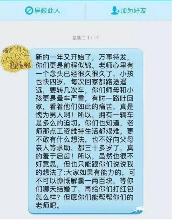 網(wǎng)帖中還上傳了數(shù)張疑似該老師與學生的QQ聊天截圖,其中的一張截圖中的對話道出了老師“眾籌”買車的原因:“新的一年又開始了,萬事待發(fā),你們更是前程似錦。老師心里有個念頭已經(jīng)很久了,小孩也快四歲了,每次回家都路途遙遠,要轉(zhuǎn)幾次車,你們師母和小孩更是暈車嚴重,有時一路吐回家,看看他們?nèi)绱送纯?,真是愧為男人啊!所以,擁有一輛車是多么的迫切。你們也知道老師那些工資維持生活都很艱難,更不敢有什么想法,也不好向父母親人求助,都三十多歲了,真的羞于啟齒!所以,雖然也很不好意思,但是也只能跟你們說說我的想法了:大家如果有能力的,可不可以慷慨解囊一兩百塊,等你們哪天結(jié)婚了,再給你們打紅包怎么樣?但愿你們能幫幫你們的老師吧。”