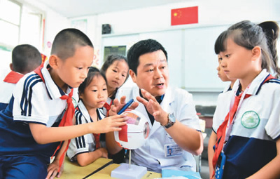 近日,在貴州省黔東南苗族侗族自治州從江縣城關第三小學,眼科醫(yī)生給學生講解健康用眼知識。(石宏輝 攝 人民視覺) 盼望著,盼望著,暑假來臨了,孩子們期待著放松身心、度過多彩的假期生活。與此同時,暑期也是科學用眼、防控近視的關鍵期。如何防止暑假期間兒童青少年視力“滑坡”?如何更愛護我們“心靈的窗戶”?記者邀請北京同仁醫(yī)院眼科副主任醫(yī)師孟昭君為家長答疑解惑。 斜視、弱視也是兒童常見眼病 “進入暑期,前來就診的孩子明顯增多了?!泵险丫榻B,在臨床上,兒童青少年常見眼病可大致分為3類:屈光不正(包括近視、遠視、散光等)、眼表疾病(如結膜炎、角膜炎等)、其他病變(如斜視、白內障、青光眼、眼底病變等)。其中,屈光不正是兒童最常見的眼病。 什么是屈光不正?孟昭君介紹,人的眼球就像一架照相機,屈光度就是眼球這個照相機“鏡頭”的光學參數(shù)。當眼睛在放松狀態(tài)下,外界的平行光線經眼睛的屈光系統(tǒng)折射后,不能在視網膜黃斑中心凹聚焦,無法產生清晰的成像,即為屈光不正,包括近視、遠視、散光等。 孩子剛出生時,一般都處于生理性的遠視——兒童眼球和視力是逐步發(fā)育成熟的,新生兒的眼球較小,眼軸較短,此時雙眼處于遠視狀態(tài)。隨著兒童生長發(fā)育,眼球逐漸長大,眼軸隨之變長,生理性的遠視會逐漸消失,視力逐步提高,完成“正視化過程”。比較理想的情況是兒童到12歲后才由遠視眼發(fā)育成正視眼。 “正視化前的遠視大多為生理性遠視,是一種‘遠視儲備’,可以理解為‘對抗’發(fā)展為近視的‘緩沖區(qū)’。如果‘遠視儲備’被消耗得過多、過快,孩子就有可能較早出現(xiàn)近視?!泵险丫嵝?,遠視儲備也不是越多越好,兒童期的生理性遠視一般不影響視力發(fā)育。當兒童遠視度數(shù)過高,可能會出現(xiàn)視疲勞、屈光調節(jié)性內斜視等問題,甚至可能影響孩子的視力發(fā)育導致弱視。因此,如果孩子遠視度數(shù)過高,就需要在醫(yī)生指導下進行相關矯正。 孟昭君觀察發(fā)現(xiàn),近年來,在臨床上斜視患兒有增多的趨勢?!靶币暿且环N常見的兒童眼病,但并不是斜著眼睛看東西就叫‘斜視’?!彼忉屨f,斜視是雙眼視軸不平行,就是當一眼注視目標時,另一眼沒有同步協(xié)調,而是發(fā)生了偏斜。這種偏斜可以表現(xiàn)為向內偏斜,也就是人們常說的“斗雞眼”;也可以向外偏斜、向上或向下偏斜,有的斜視甚至是旋轉性的?;加行币暤膬和枰霸缇驮\,避免影響雙眼視覺功能發(fā)育。 何為弱視?專家介紹,弱視是指患者單眼或雙眼最佳矯正視力低于相應年齡正常兒童,并且眼部檢查無器質性病變,或雙眼最佳矯正視力相差2行及以上,視力較低眼為弱視。單眼斜視、屈光參差、高度屈光不正等因素都有可能導致弱視的出現(xiàn)。大部分的弱視可以治愈,且年齡越小、發(fā)現(xiàn)越早,治療效果越好,年齡越大越難治療。 “近年來,我國要求對0至6歲兒童和中小學生進行定期視力檢查,并建立兒童青少年視力健康檔案,這是非常有必要的?!泵险丫f,這有利于早期篩查出兒童青少年視力異常狀況,有助于實現(xiàn)對斜視、弱視等眼病的早發(fā)現(xiàn)、早診斷、早治療。 3歲以下兒童盡量別用電子產品 國家衛(wèi)健委數(shù)據顯示,2020年全國兒童青少年總體近視率為52.7%,其中6歲兒童為14.3%,小學生為35.6%,初中生為71.1%,高中生為80.5%。近視已成為當下兒童青少年比較普遍的眼健康問題。 “近視的發(fā)病受先天和后天因素影響?!痹诿险丫磥?,近視防控做得越早越好,0—6歲是兒童健康保護和近視防控關鍵期。 暑假期間,一些兒童青少年可能會長時間看電腦和電視、玩手機游戲等,導致無節(jié)制地用眼。在這種情況下,家長應該如何進行干預、防止孩子視力“滑坡”? “建議家長幫孩子把興趣轉移到別的方面,比如帶著孩子多進行戶外活動,盡量少使用電子產品?!泵险丫ㄗh,3歲以下的兒童盡量不要使用電子產品;如果3—6歲兒童非要使用電子產品,一定要減少近距離用眼時間,控制使用總時間,每天使用電子產品總計不超過30分鐘;中小學生電子產品使用單次不宜超過15分鐘,每天累計不宜超過1小時。如果使用電子產品,在有條件的情況下應盡量選擇屏幕較大且分辨率較高的電子產品,并盡量遠距離觀看,建議的優(yōu)先順序為投影儀、電視、電腦、平板電腦,不建議手機。此外,學齡兒童還需牢記“20—20—20”用眼規(guī)則,即近距離用眼20分鐘,需要眺望20英尺(約6米)遠的物體至少20秒。 科學、合理安排孩子的飲食,對近視防控也有重要影響。孟昭君建議,兒童青少年應該做到營養(yǎng)均衡,不偏食、不挑食,適當攝取富含各種維生素、蛋白質和鈣的食物,比如新鮮蔬菜、水果、肉、魚、蛋、奶以及堅果等食物。此外,要少吃甜食及含糖量高的飲料,因為身體在代謝糖分的同時會消耗過量的維生素B1,并且阻礙鈣的吸收,從而影響眼球壁的硬度,可能導致眼軸拉長,導致近視的發(fā)生。 預防近視還需要增加戶外活動?!拔覀兘洺純旱募议L說,每天白天要保證2個小時以上的戶外活動?!泵险丫f,太陽光光譜廣,有利于促進眼部多巴胺釋放,而多巴胺能有效抑制近視的發(fā)生和發(fā)展。有研究表明,保持每天累計2小時、每周14小時以上的戶外活動,可以使孩子的近視發(fā)生率降低10%以上