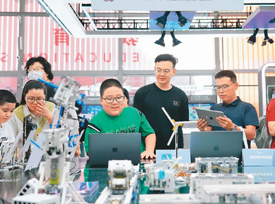 圖為在首鋼園教育服務專題展區(qū),小朋友在體驗智能硬件編程作品。