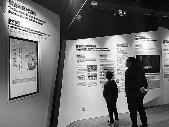 北京外國(guó)語(yǔ)大學(xué)世界語(yǔ)言博物館,一對(duì)父子正在參觀。