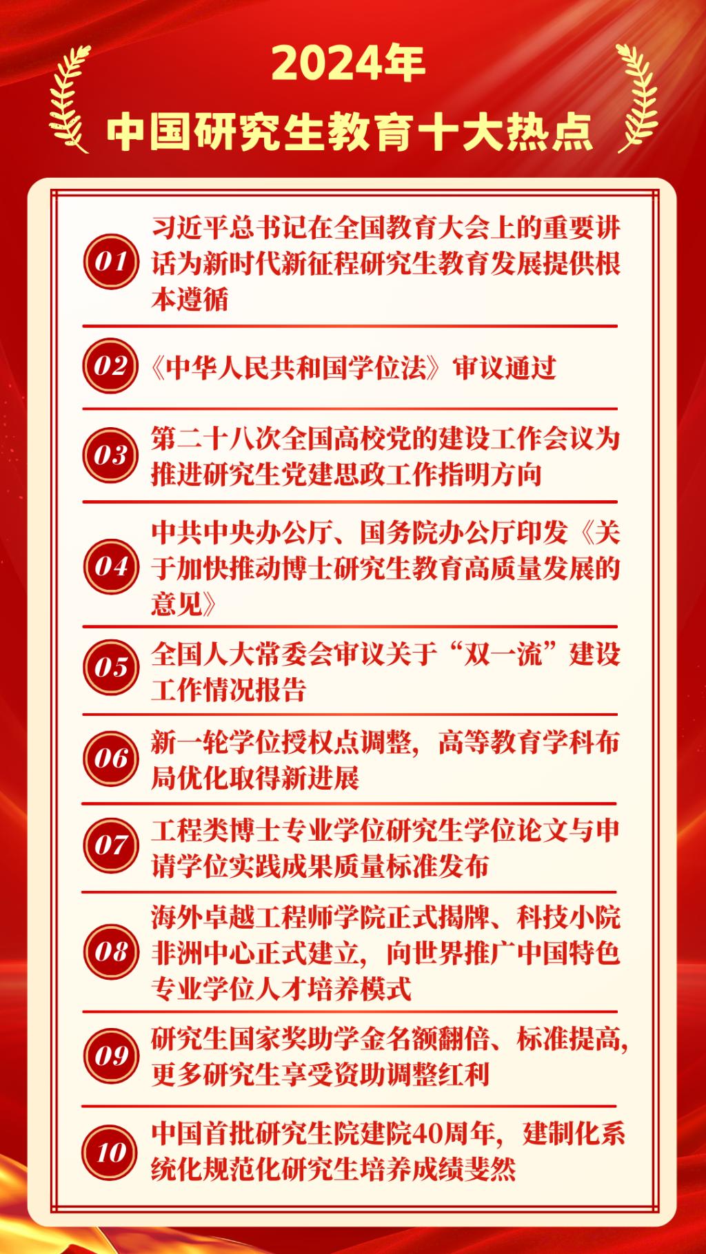 2024年,是中國學位與研究生教育發(fā)展史上具有重要里程碑意義的一年,在教育部學位管理與研究生教育司指導下,教育部學位與研究生教育發(fā)展中心《中國研究生》雜志回顧總結全年研究生教育大事要事和熱點動態(tài),聯(lián)合人民網、新華網、中國教育報和有關研究生教育媒體等共同發(fā)布2024年中國研究生教育十大熱點。