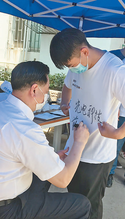 華中科技大學(xué)校史館旁,豎起一面“小清新”風(fēng)格的迎新標(biāo)語(yǔ),“愿你歷盡千帆,歸來(lái)仍是少年”,畢業(yè)生們紛紛駐足留影。在韻苑12棟樓下的遮陽(yáng)棚里,應(yīng)光電學(xué)院畢業(yè)生劉一哲的請(qǐng)求,校長(zhǎng)李元元拿起簽字筆,在其文化衫上寫下祝福語(yǔ)。