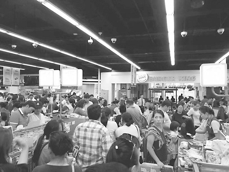 圖片說明: 烏蘭巴托8月初開業(yè)的一家韓國(guó)商場(chǎng)收銀臺(tái)前人滿為患,絲毫沒有危機(jī)氛圍。楊濤攝