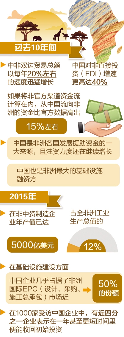 從經(jīng)營(yíng)領(lǐng)域上看,調(diào)查顯示,中國(guó)企業(yè)在非洲的經(jīng)營(yíng)領(lǐng)域十分廣泛,除制造業(yè)外,服務(wù)業(yè)企業(yè)占比達(dá)四分之一,貿(mào)易企業(yè)與建筑及房地產(chǎn)企業(yè)占比各為五分之一。2015年,在非中資制造企業(yè)年產(chǎn)值已達(dá)5000億美元,占全非洲工業(yè)生產(chǎn)總值的12%。在基礎(chǔ)設(shè)施建設(shè)方面,中國(guó)企業(yè)的主導(dǎo)地位更為明顯——幾乎占據(jù)了非洲國(guó)際EPC(設(shè)計(jì)、采購(gòu)、施工總承包)市場(chǎng)近50%的份額。中國(guó)企業(yè)的盈利也相當(dāng)可觀,在1000家受訪企業(yè)中,有近四分之一企業(yè)表示在一年甚至更短時(shí)間里便能收回初始投資,三分之一的企業(yè)利潤(rùn)率超過20%。而且,這些企業(yè)的市場(chǎng)觸覺極其敏銳,能夠迅速適應(yīng)新環(huán)境、響應(yīng)新機(jī)遇。這些企業(yè)主要側(cè)重滿足非洲日益增長(zhǎng)的市場(chǎng)需求,而非出口業(yè)務(wù)。許多中國(guó)企業(yè)已在非洲開展了長(zhǎng)期投資,有74%的受訪中資企業(yè)對(duì)未來(lái)發(fā)展前景抱有樂觀態(tài)度。