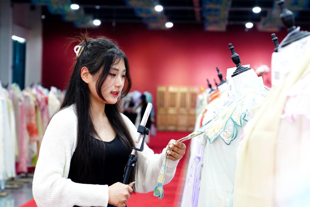 “85后”的黃曉燕曾在南方打拼十余年,如今成為曹縣穿越大唐漢服云倉經(jīng)理?!半m然是在鄉(xiāng)鎮(zhèn)工作,但貼近市場,節(jié)奏非???,每天顧客絡繹不絕?!彼谡箯d里邊走邊介紹,公司自主設計的漢服涵蓋唐、宋、明、清等品類,并根據(jù)人們?nèi)粘Vb特點加以改良。在這里,不僅能夠私人訂制服裝,還有AI直播改善線上消費體驗。