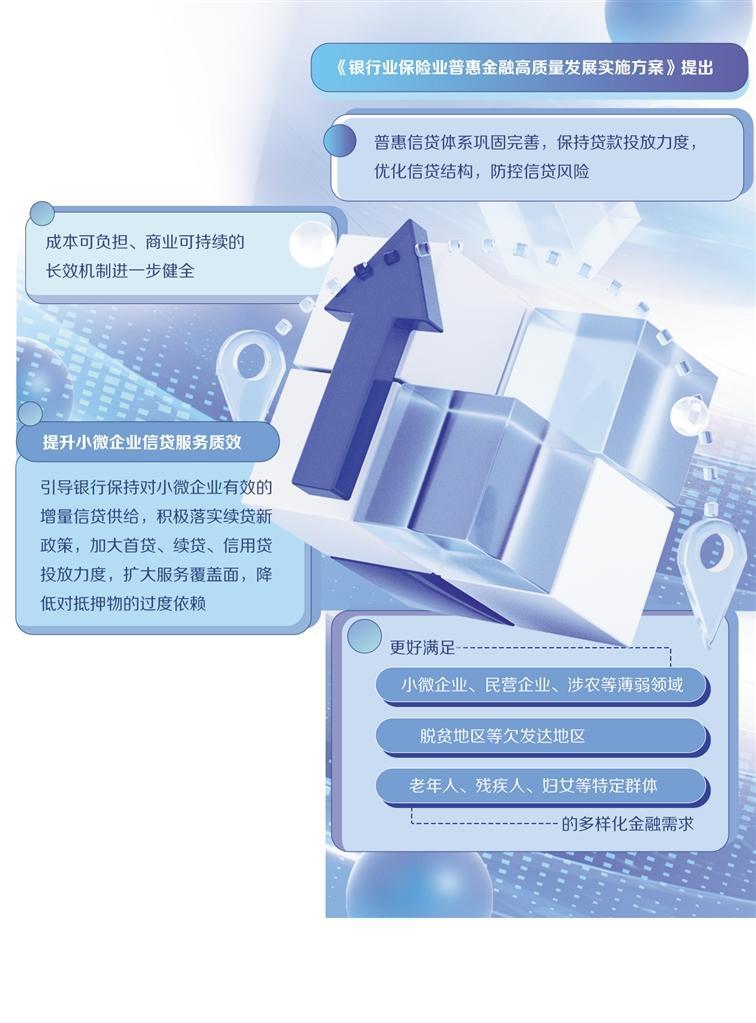 近年來,我國普惠金融發(fā)展取得長足進(jìn)步,金融服務(wù)的普惠性不斷提升。近期印發(fā)的《銀行業(yè)保險業(yè)普惠金融高質(zhì)量發(fā)展實施方案》(以下簡稱《實施方案》)在主要目標(biāo)中提出,普惠信貸體系鞏固完善,保持貸款投放力度,優(yōu)化信貸結(jié)構(gòu),防控信貸風(fēng)險,成本可負(fù)擔(dān)、商業(yè)可持續(xù)的長效機(jī)制進(jìn)一步健全,更好滿足小微企業(yè)、民營企業(yè)、涉農(nóng)等薄弱領(lǐng)域,脫貧地區(qū)等欠發(fā)達(dá)地區(qū)以及老年人、殘疾人、婦女等特定群體的多樣化金融需求。